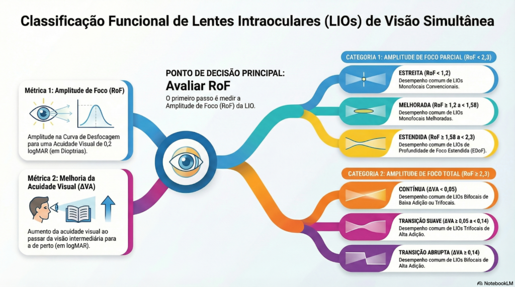 A nova estrutura divide as lentes em categorias de alcance parcial ou alcance total, facilitando a distinção entre tecnologias como as monofocais avançadas, as de foco estendido (EDOF) e as multifocais. Esse método busca padronizar a comunicação científica e auxiliar cirurgiões a preverem melhor a independência de óculos e a qualidade de visão após a cirurgia. O objetivo final é estabelecer um consenso global que priorize como o paciente enxerga em diferentes distâncias no cotidiano.